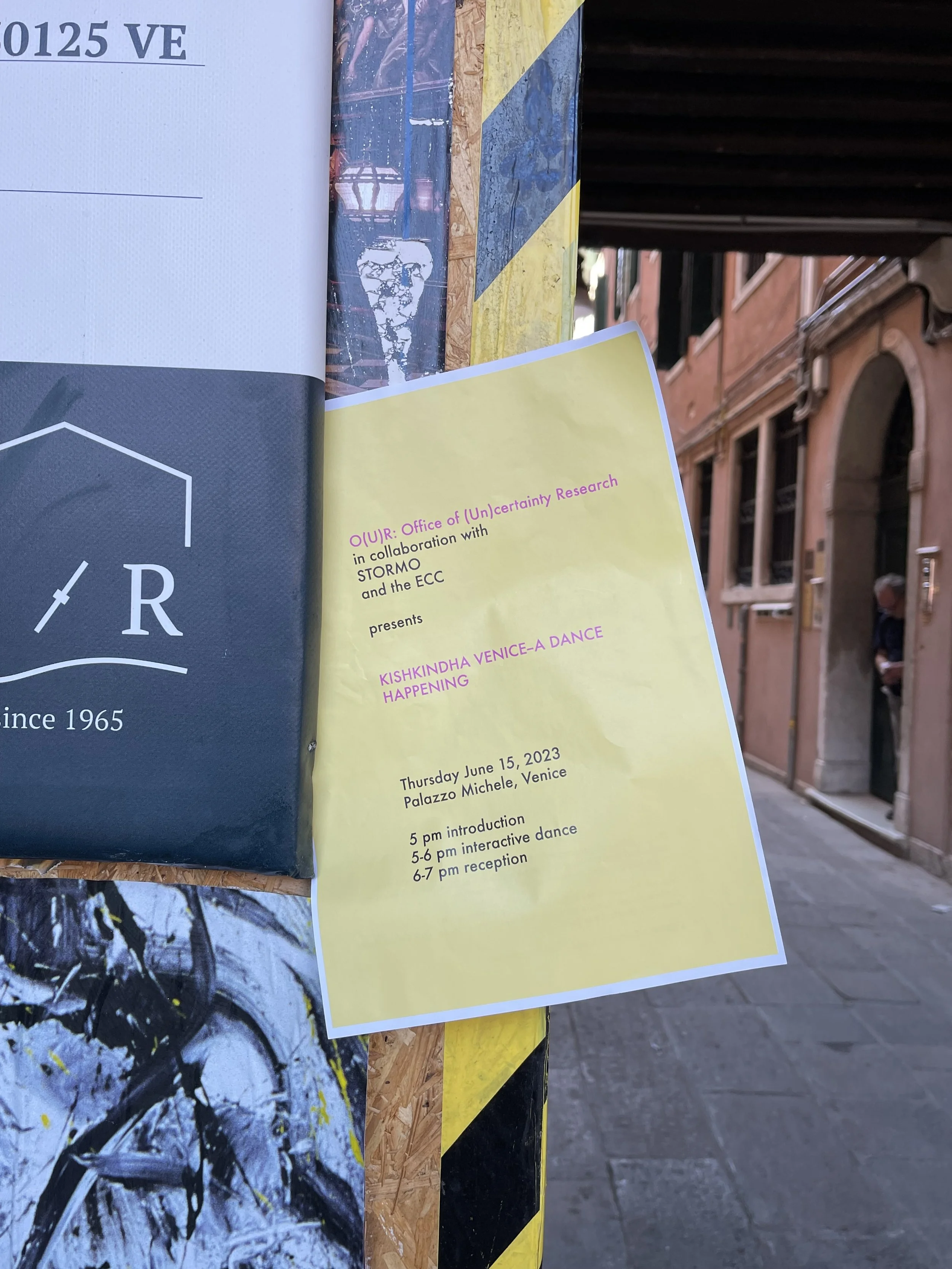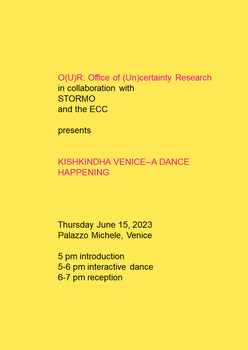O(U)R has commissioned a dance group in Venice called STORMO to perform a Dance-Happening around the theme of Kishkindha NY. It will be choreographed by the noted dancer, Carla Marazzato. The event will take place at 5 PM at the Palazzo Michiel in Venice. It is free and open to the public, but audience size is limited. If interested, contact O(U)R.